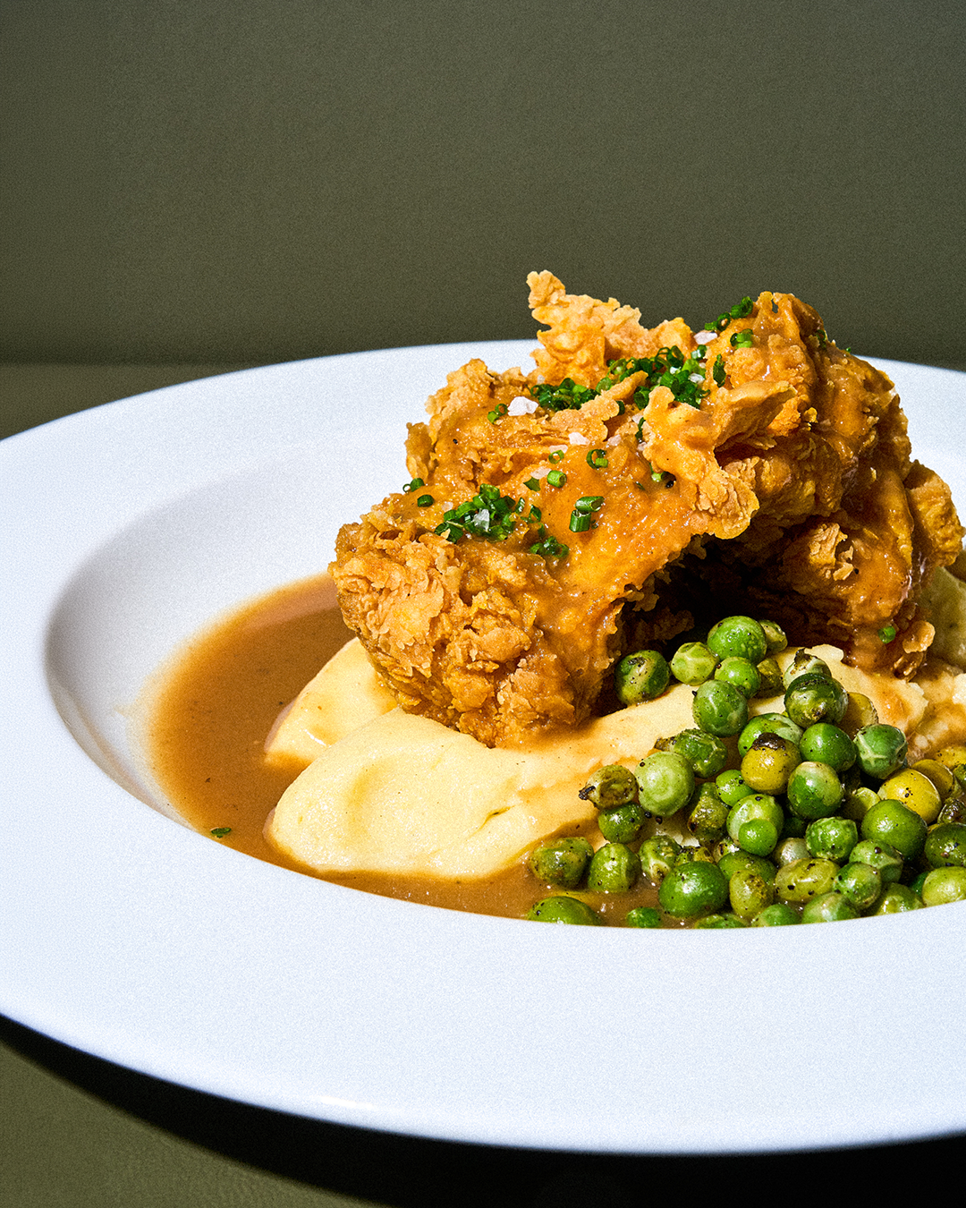 Nuestro Pollo Frito Gravi es Contramuslo deshuesado y rebosado, pure de papa, arvejas parrilladas y salsa gravy