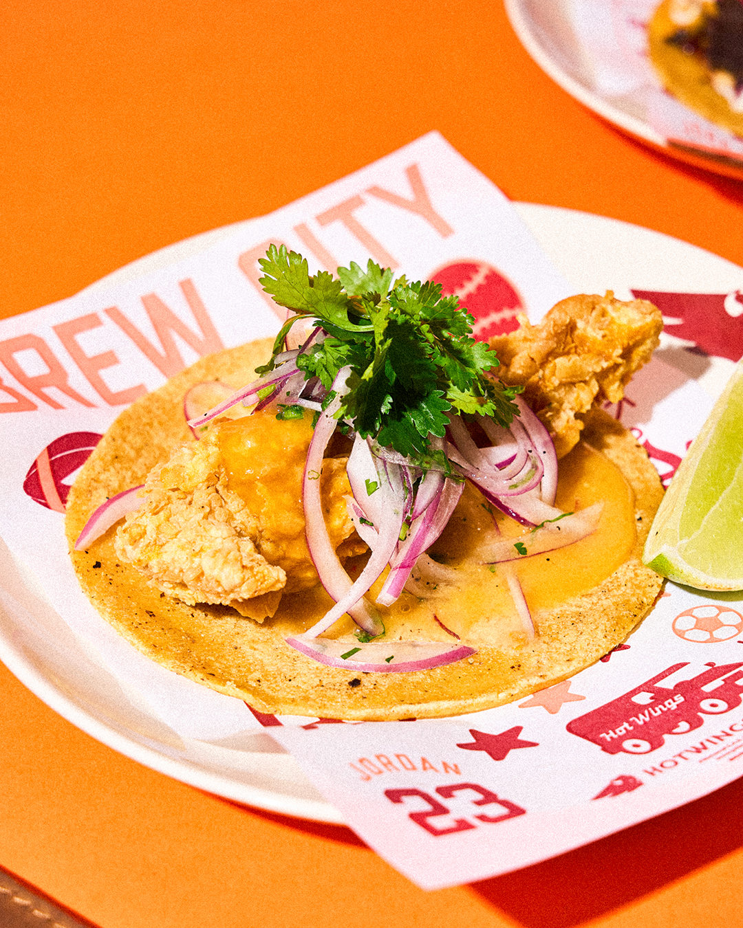 Nuestros Taco de Pollo Frito es filete de pechuga en Rub de la casa y luego rebosado, mango habanero y cebollas acevichadas.